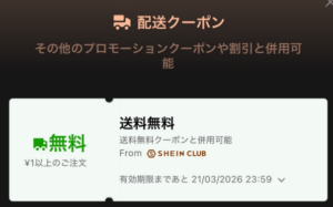 「SHEIN CLUB」に加入すると、1円以上の買い物で送料が無料になる「送料無料クーポン」がもらえます。本クーポンは「お急ぎ便」に使用できます。