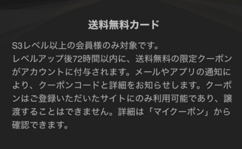 SHEINの「SHEIN VIPリワード」のS3レベルアップ特典で送料無料クーポンがもらえます。VIPはS3からS1までランクがあり、S3ランクは1年に50,000円以上の注文、または7回以上注文が必要です。