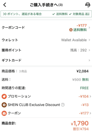 送料無料クーポンは購入時に自動的に反映されるため簡単に使用できました。ですが、入手方法は「SHEIN CLUBの会員向けの配布」「SHEIN VIPプログラムからの配布」「イベントで先着限定配布」と限定的です。送料無料クーポンこだわるのは非効率的かもしれません。