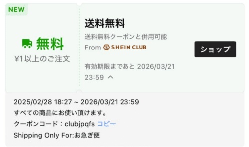 SHEIN CLUBで配布される送料無料クーポン