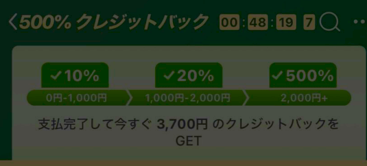 初めて500%クレジットバックが出現しました。2600円購入すると、3700円分のクレジットが還元されるという内容で驚きました
