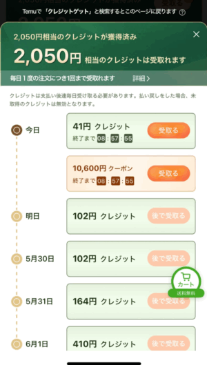 本イベントは、イベントページで商品を購入すると、クレジットとクーポンがもらえるというイベントです。Temuには様々なイベントがありますが、本イベントは1番お得です!