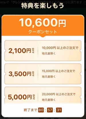 Temuのクレジットバックイベントは複数あるので、間違えないように気をつけてください。14000円以上購入して10000円クレジットが戻ってくる「10000円クレジットバック」については下の記事で詳しく解説しています。こちらもかなりお得なイベントですよ。