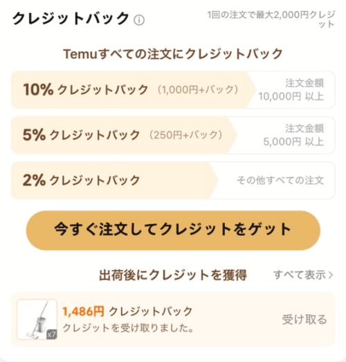 「2回目の注文ボーナス」は、2025年9月頃からTemu circleに出現した新サービスです。1回目の注文7,000円以上で30%クレジット還元が受けられて、続けて、2回目の注文では7,000円以上で50%クレジット還元が受けられるというものです!2回目の注文ボーナスイベントのクレジットバックは他のイベントのクレジット特典と同時に利用できないので注意してください。