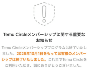Temu Circle(テムサークル)は2025年10月1日に終了したとのお知らせがありました。