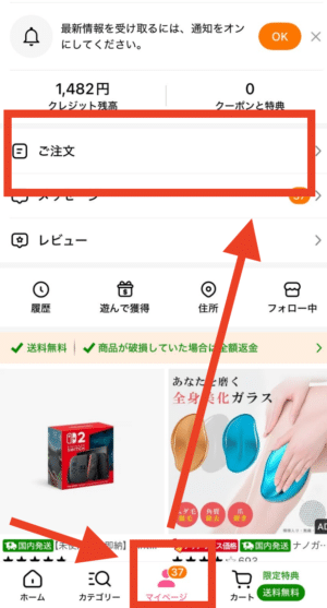 アプリの場合:画面下部「マイページ」→「ご注文」の順にタップします。PCの場合:temu.com右上のプロフィールアイコンをクリック→「ご注文」を選択します。どちらも「ご注文」というメニュー名を探すのが最短です。