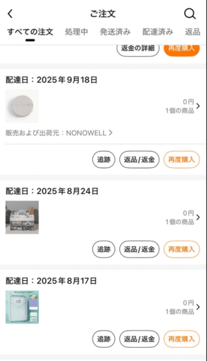 購入履歴(過去の完了した注文)を見たい場合は、「配達済み」タブを選ぶのが最短ルートです。ここに全ての購入済み商品が一覧表示されます。