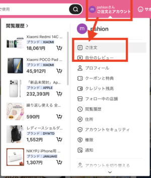 PCのブラウザからtemuの購入履歴を確認する手順