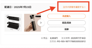 注文の詳細ページが開き、商品名・金額・配送状況などが確認できる